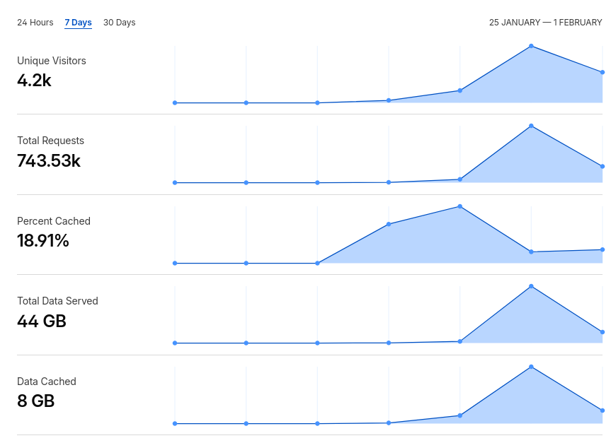 La plateforme CTFd a été proxifiée via Cloudflare, ce qui a grandement allégé la charge grâce à leur système de cache tout en offrant des protections anti-DDoS. Au total, 743.53k requêtes ont été enregistrées sur la plateforme, et l’infrastructure a tenu la charge sans problème.